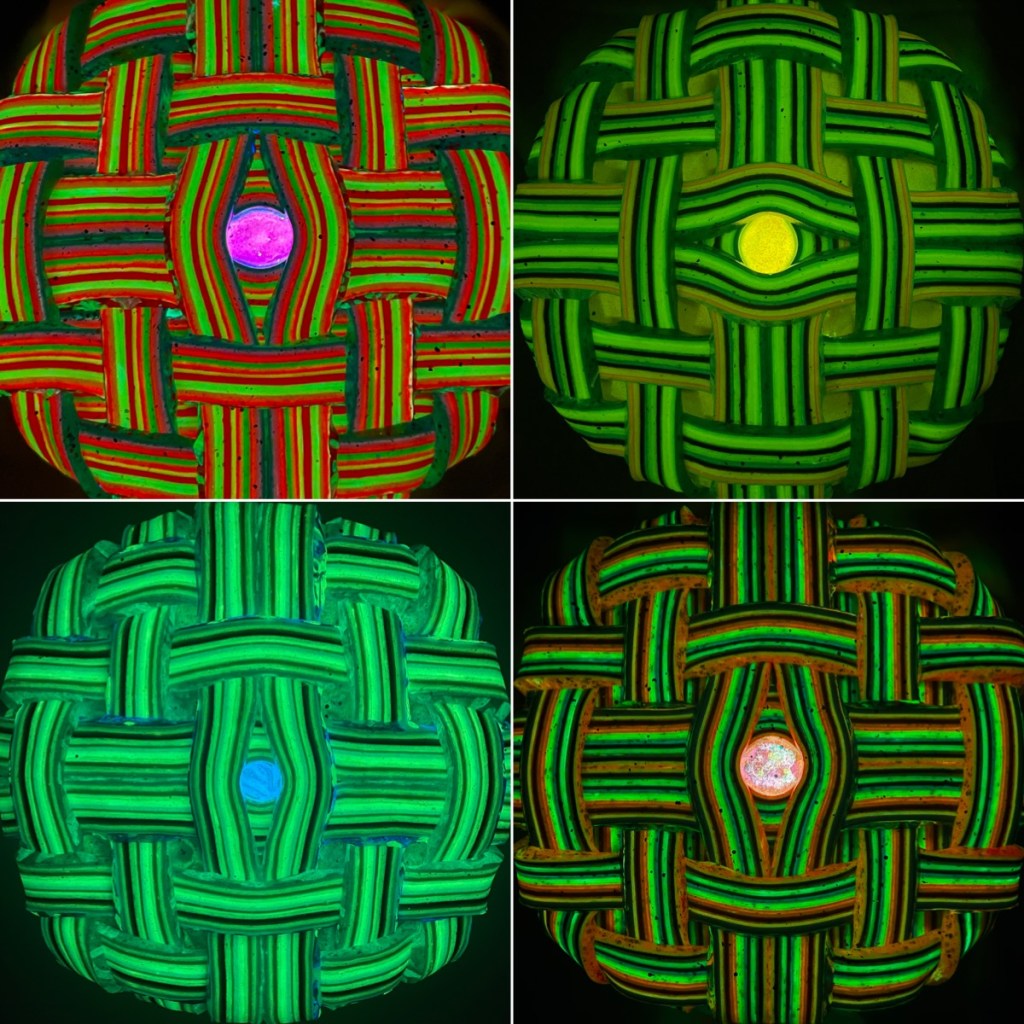 These four meditation weaves can stand alone or come together as a harmonious set. Individually, each one takes nearly a season to create. Layers of glue and paint are poured over a span of a month or more into a cake, and from this, the threads are deftly sliced and woven together. It then takes another month or two for them to dry, and this process cycles, much like the seasons themselves.
