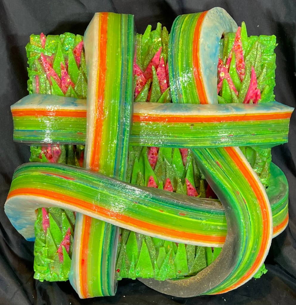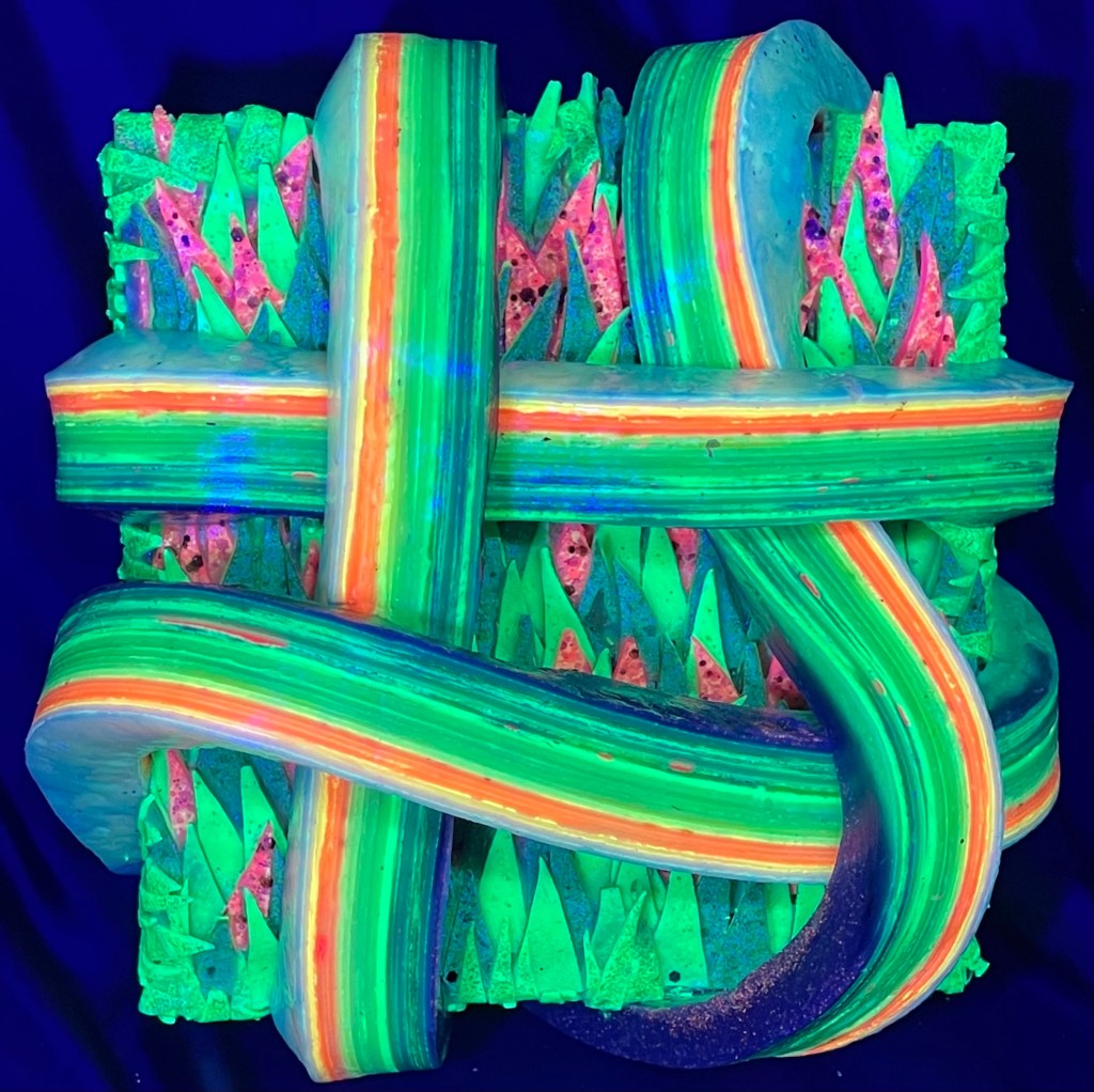 As a New York-based artist, I find deep inspiration in the relationship between sculptural form and vibrant color, crafting a visual language that invites viewers into an active and layered experience. My practice centers around the construction of dimensional works by weaving strips of paint and glue onto wood panels—a process that merges precision, materiality, and play.