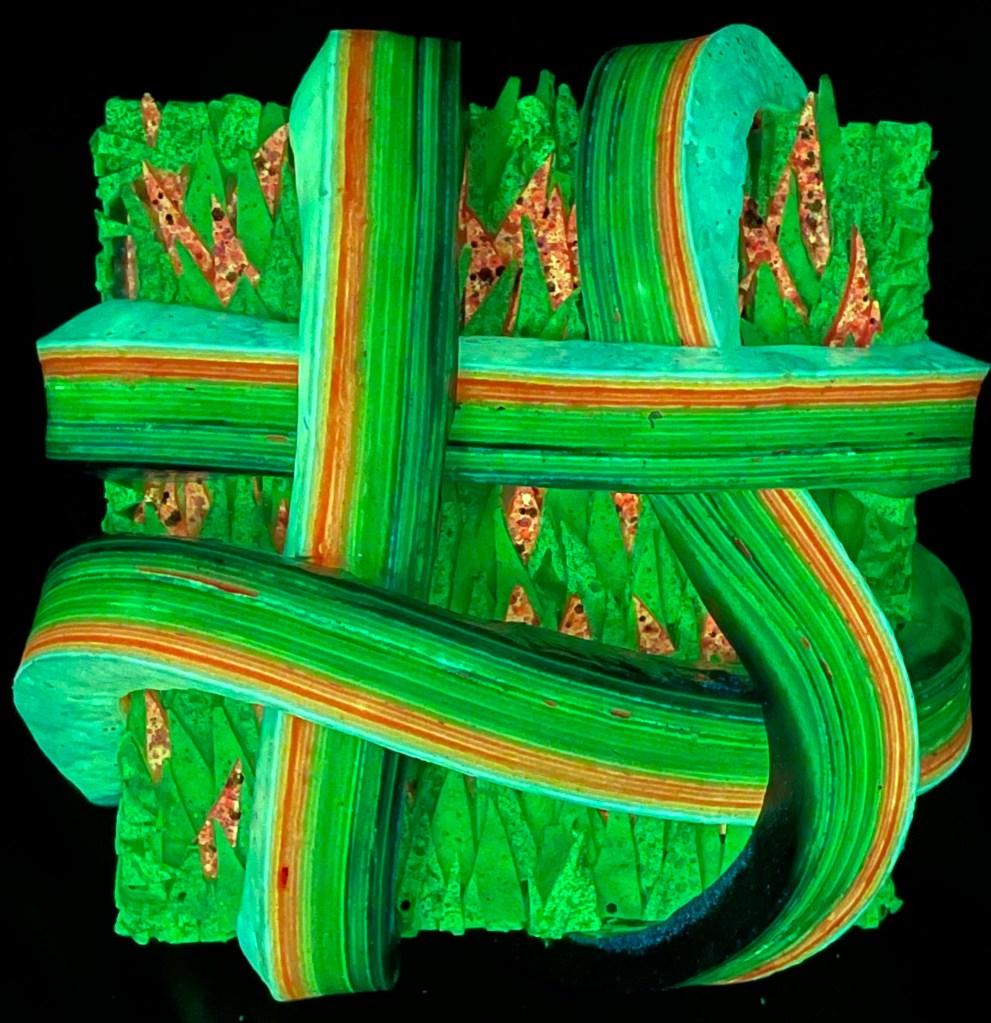 At the heart of my work is the creation of the paint strips themselves. I begin by layering paint and glue into a dense, cake-like surface, which I then slice into thin, uniform bands. These hand-cut strips serve as both the structure and surface of my compositions, transforming everyday materials into tactile, multi-dimensional forms.